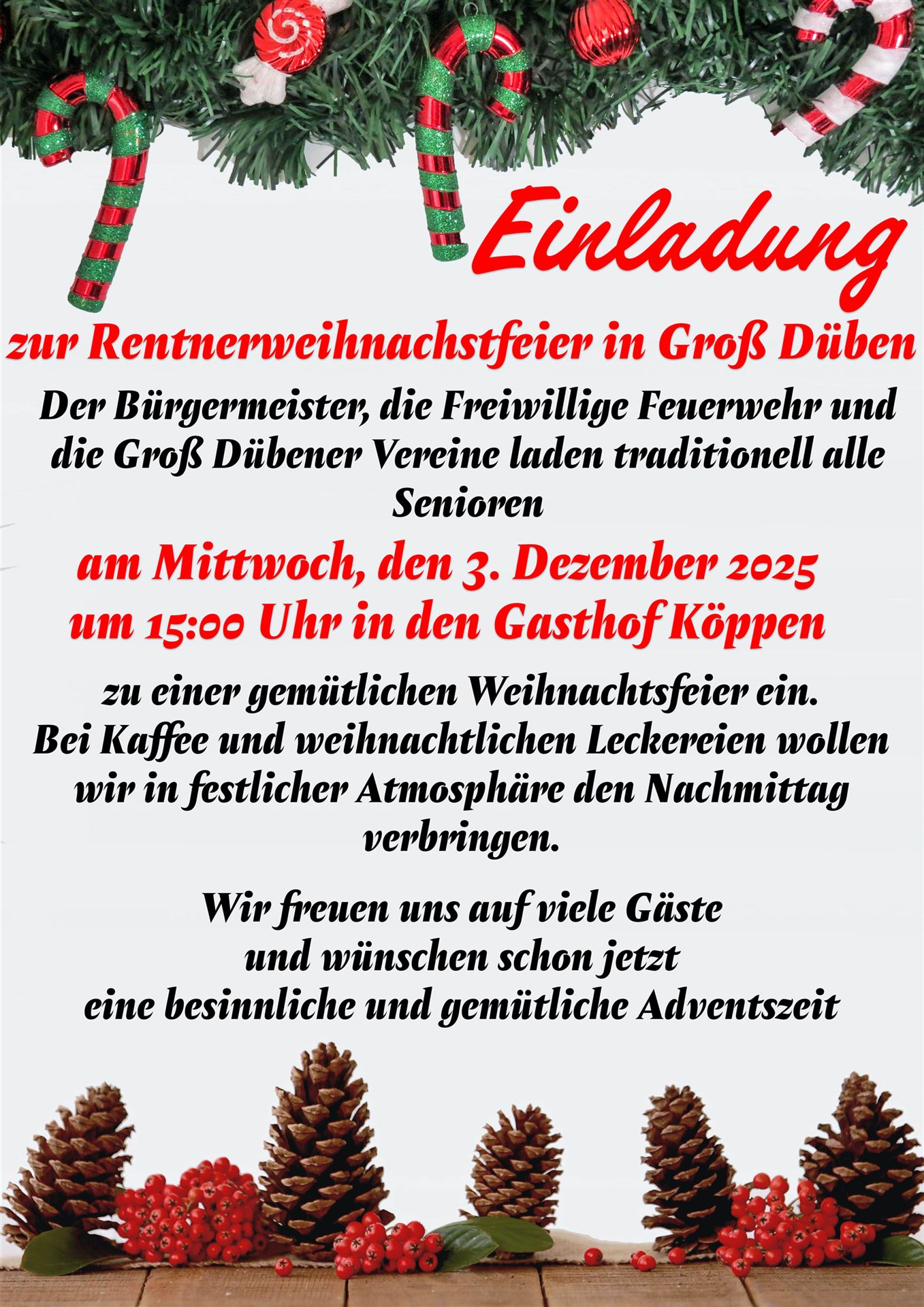 Der Gemeinderat Groß Düben beschloss, auf Empfehlung des Ausschusses in seiner öffentlichen Sitzung am 06.11.2025, die mobile Entsorgung von abflusslosen Gruben und Kleinkläranlagen (dezentrale Abwasserbeseitigung) an die Firma: