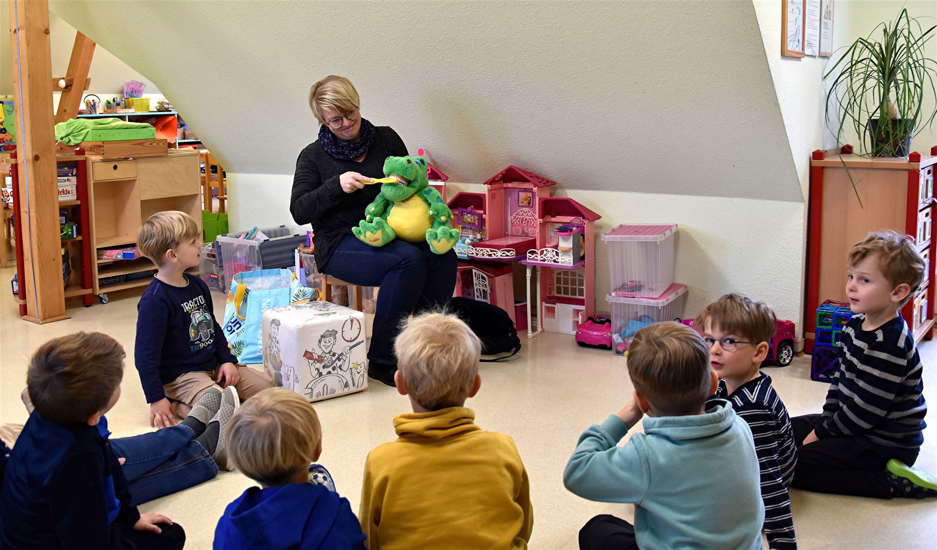 Der Besuch der Zahnärztin Theresa Eger vom Kinder- und jugendzahnärztlichen Dienst (Landkreis Görlitz) im "Spatzennest" dient dazu, frühzeitig die Mundgesundheit von Kindern zu überwachen, präventive Maßnahmen zu ergreifen und Eltern in der Zahnhygiene ihrer Kinder zu unterstützen. Durch regelmäßige Kontrollen im Kindergarten können mögliche Probleme frühzeitig erkannt und behandelt werden, während gleichzeitig die Bedeutung der Mundpflege betont wird. Gleichzeitig wurde in einer anderen Kita -Gruppe die Prophylaxe (Vorbeugung) erklärt.