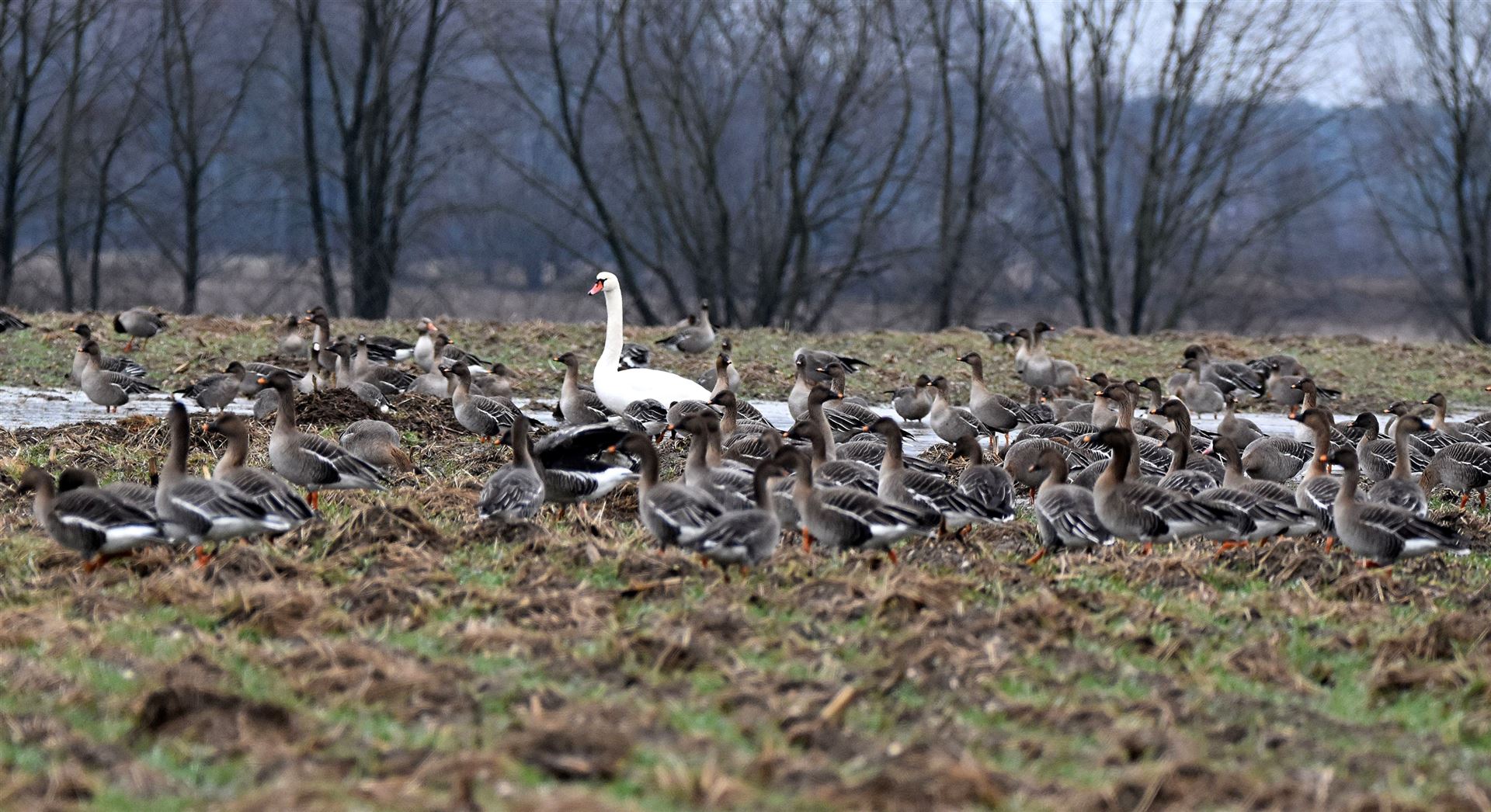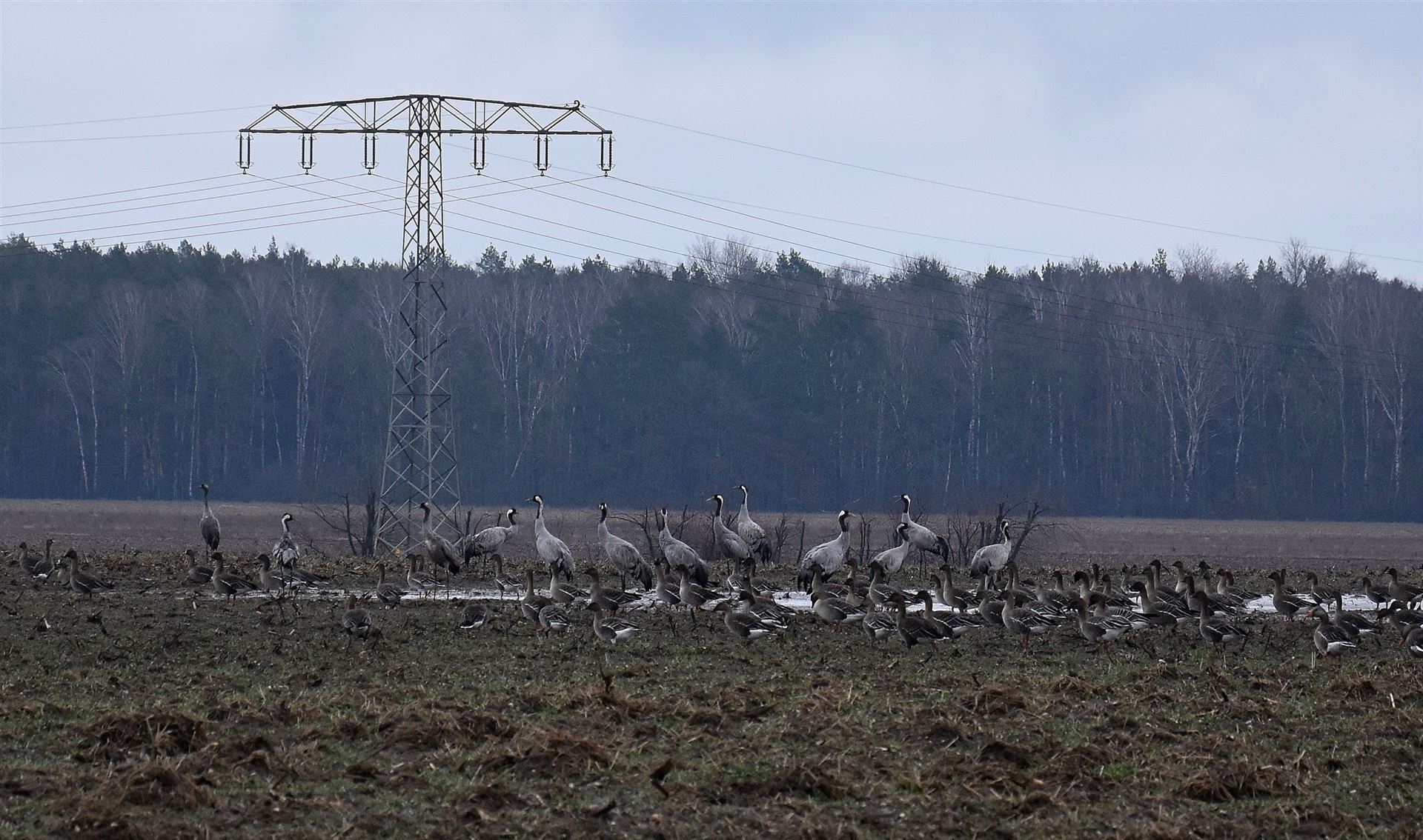 Graugänse, Schwäne und Kraniche auf Futtersuche zwischen Groß Düben und Halbendorf
