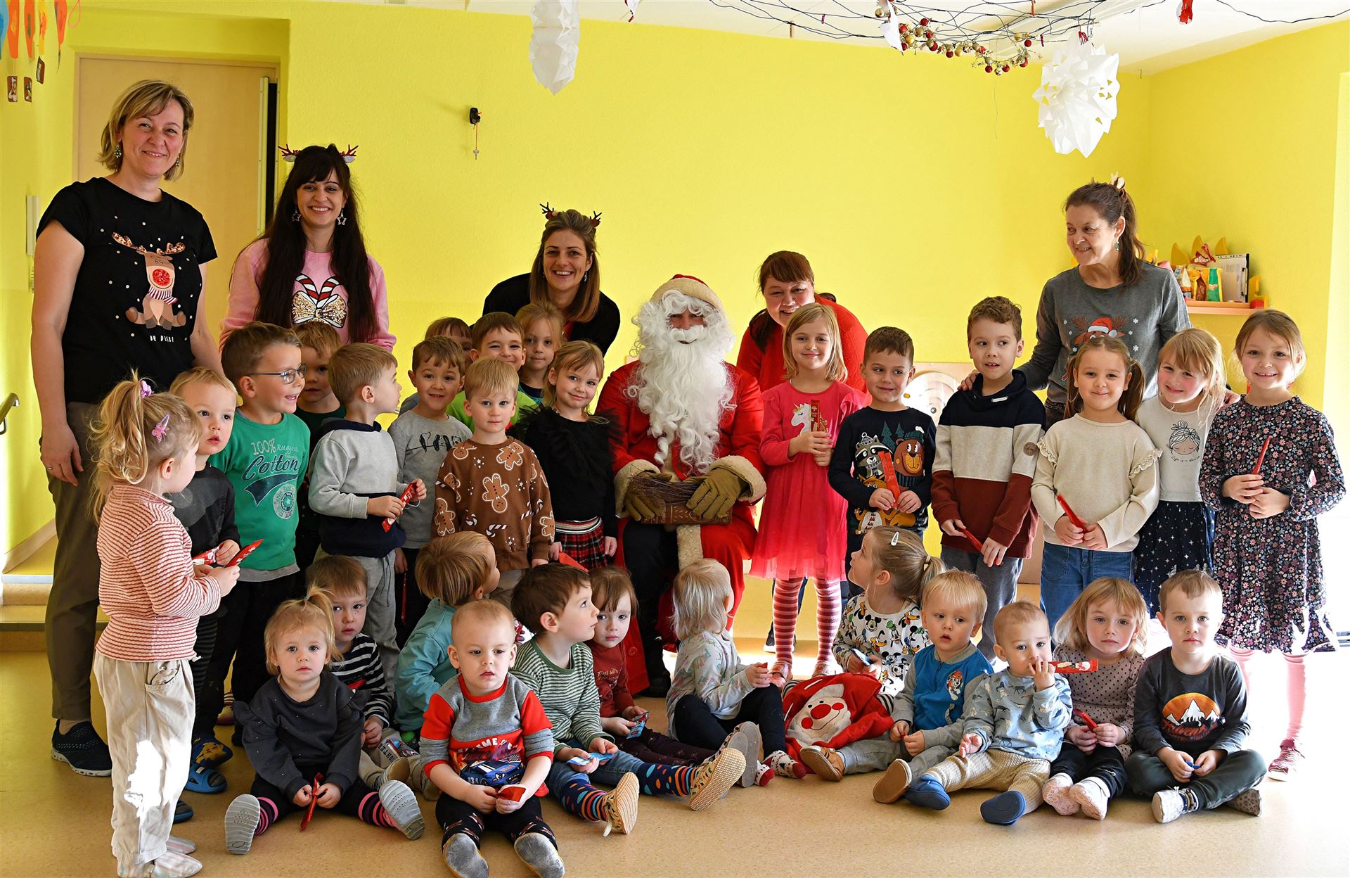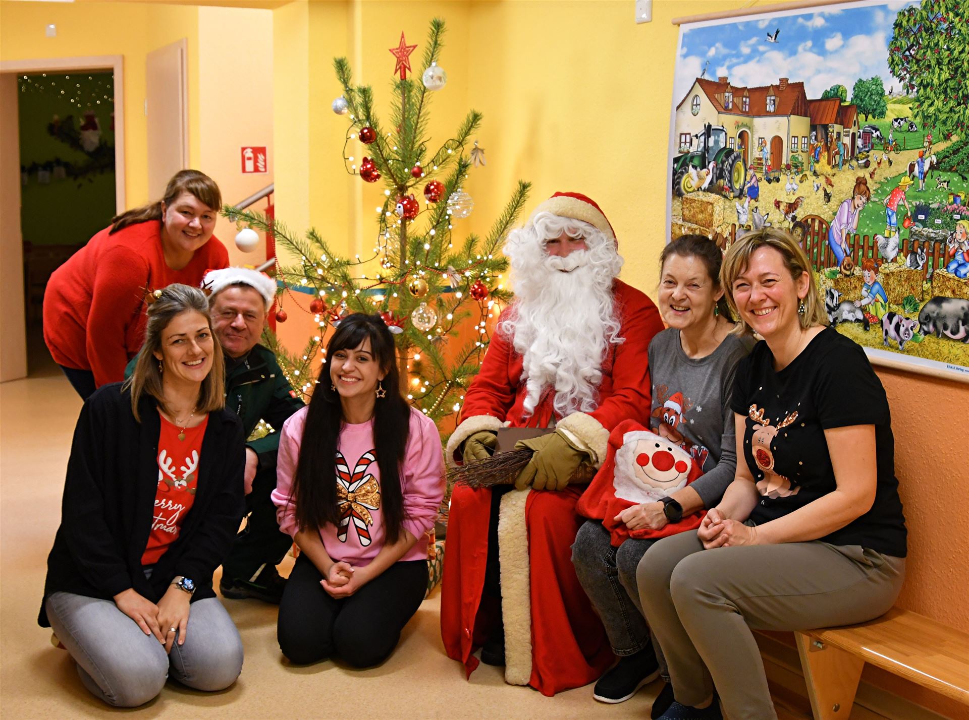 Weihnachtsmann mit Erzieherinnen und Bauhofmitarbeiter